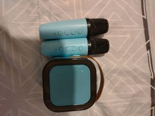 Sistema de sonido karaoke portátil con dos micrófonos. - Nuevo. Sólo se ha probado. Pero tiene todos los envoltorios y caja, tal como venía. - Altavoz con diseño moderno. - Incluye dos micrófonos para cantar, cable de carga y altavoz. - Se puede ajustar volumen, delay o eco en los micrófonos. - Conexión Bluetooth y cable para cargar. - Fácil de transportar. - Recargable.