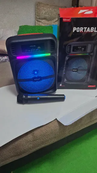 Altavoz portátil de la marca Kbroad con luces LED y micrófono incluido. Ideal para fiestas y eventos. - Diseño moderno en color negro. - Luces LED multicolor que cambian de ritmo. - Incluye micrófono para karaoke. - Conectividad inalámbrica.