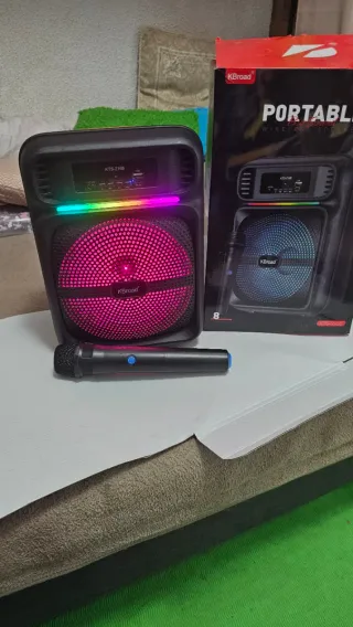 Vendo altavoz karaoke portátil con luces LED multicolor. Es un artículo nuevo, ideal para fiestas o karaoke en casa. - Incluye micrófono inalámbrico. - Diseño compacto y ligero. - Luces LED que cambian de color.