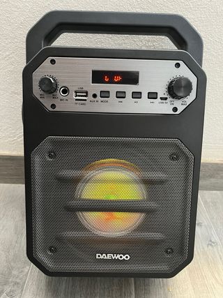 Altavoz portátil bluetooth Daewoo. Genial para escuchar tu música, radio fm o divertirte en karaoke. Con luces led incorporadas para ambientes de fiesta y micrófono con su cable. Potencia 15w, con conexiones usb, micro sd, micrófono, aux in.