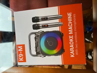 Equipo de karaoke K9-M con altavoz y dos micrófonos inalámbricos. - Altavoz con luces LED multicolores. - Diseño portátil con asa. - Incluye dos micrófonos inalámbricos.