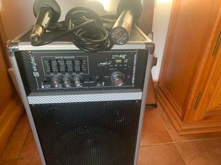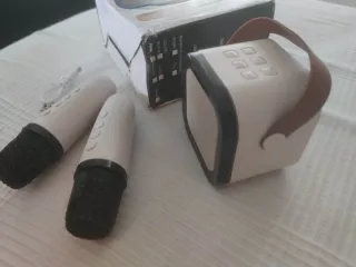 Sistema de karaoke portátil con altavoz y dos micrófonos. Completamente nuevo - Altavoz con asa de transporte. - Dos micrófonos inalámbricos. - Incluye cable de carga.