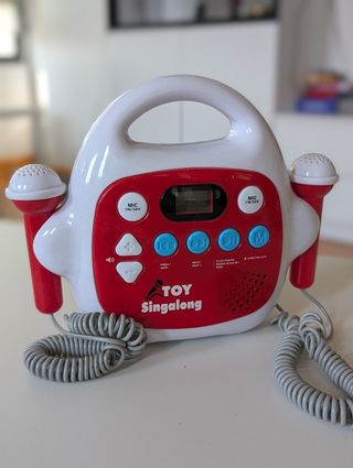 Karaoke portátil TOY Singalong en estupendas condiciones. Es ideal para que los más pequeños de la casa den rienda suelta a su talento musical. Comprado en Juguettos. - Incluye dos micrófonos. - Conexión USB. - Diseño atractivo y colorido.