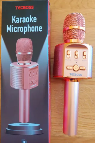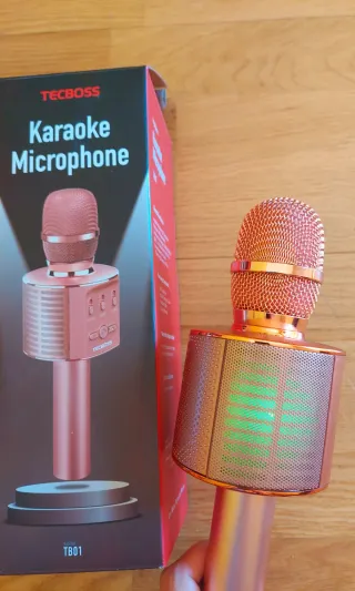 Micrófono de karaoke de la marca TEC BOSS en un bonito acabado rosa dorado. -Microfono y altavoz inalambrico. -Bluetooth, cable USB. -Sonido estéreo. -Con led de colores