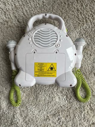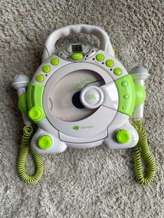 Reproductor de CD diseñado para niños, con un divertido diseño. - Incluye dos micrófonos. - Controles de volumen y música. - Asa para fácil transporte.