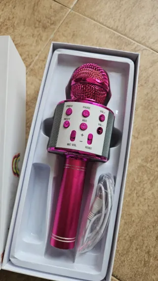 Micrófono karaoke con estuche protector, ideal para fiestas. Es ligero y fácil de transportar. - Incluye estuche de transporte. - Diseño elegante y moderno. - Controles de volumen y efectos. Es un micrófono, altavoz karaoke Bluetooth. La entrega es en Getafe central y el dinero en mano