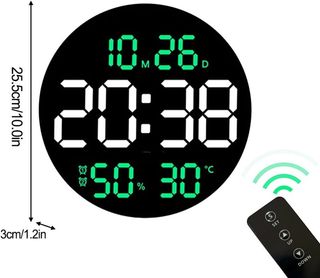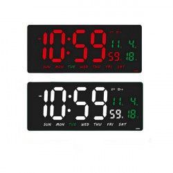 Moderniza tus espacios con este elegante reloj digital combina funcionalidad y estilo decorativo con modos de cuenta regresiva, pausa, temporizador y higrómetro ambiental. Funciona con cable USB (incluido) y baterías AAA (para memoria). ✅ Características: 🕒 Pantalla LED de 10” con dígitos grandes y segundero visible ⏰ Alarma dual con función snooze y temporizador integrado 🌡️ Sensor de temperatura y humedad (higrómetro) 💡 Brillo automático en 10 niveles + ajuste manual vía mando 🔁 Formato horario 12/24H + fecha en inglés o chino 🖼️ Diseño moderno ideal para salón, dormitorio, oficina, cafetería o escuela