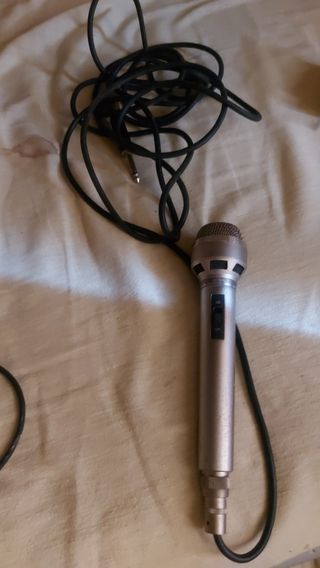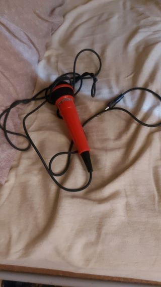Dos micrófonos para karaoke en buen estado. Uno es plateado y el otro rojo. - Ideales para fiestas y diversión. - Incluyen cables. - Listos para usar.