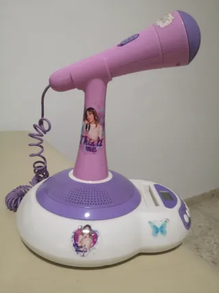 Micrófono con base para karaoke y música, ideal para los más pequeños. Presenta un diseño divertido con imágenes. - Base con altavoz integrado. - Micrófono con cable en espiral. - Botones de control en la base. - Pantalla digital pequeña.