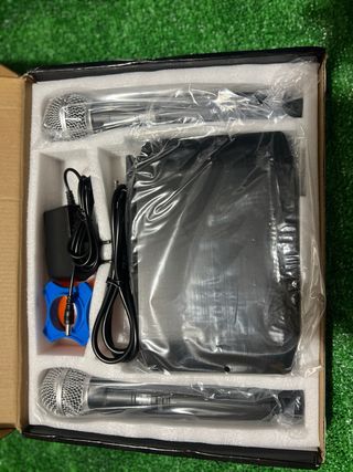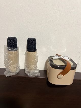 El producto está completamente nuevo, nunca se ha utilizado. Dispone controladores de audio avanzados y procesadores de señal digital para obtener una calidad de sonido clara y estereoscópica. Micrófonos inalámbricos se conectan en segundos listos para usar sin emparejamiento. Los micrófonos están integrados para un fácil almacenamiento con la ranura adecuada. Micrófonos profesionales con efecto KTV que mejoran tu voz de canto. Potente altavoz Bluetooth, conexión entrada auxiliar tarjeta TF , USB y entrada tipo C
