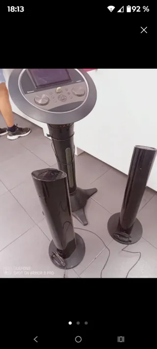 Equipo de karaoke con un diseño moderno y elegante. - Unidad principal con pantalla. - Dos altavoces cilíndricos negros dos micrófonos . Ideal para fiestas etc pantalla táctil etc se conecta vía wifi, bluetooth y USB Entrada HDMI se puede poner hasta 4 altavoces. Karaoke profesional. Saludos
