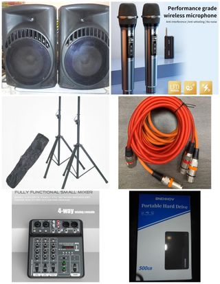 Sistema de karaoke profesional de alta calidad. compuesto por pantallas acústicas vonix de 200W una etapa de potencia de 400W, Una pareja de tripodes robustos, dos micrófonos inalambricos UHF profesionales, Mesa de mezclas 4 canales con bluetooth y efectos, cableado completo y con la compra regalamos un disco duro de 500Gb con mas de 35.000 karaokes y programas de reprodución para instalar - Dos altavoces VONYE. - Amplificador. - Mesa de mezclas. - Soporte para altavoces. - Cable profesional.