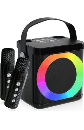 Sistema de karaoke portátil con dos micrófonos incluidos. Ideal para animar cualquier reunión. - Diseño moderno y compacto. - Luces LED circulares multicolor. - Asa para fácil transporte. - Dos micrófonos negros.