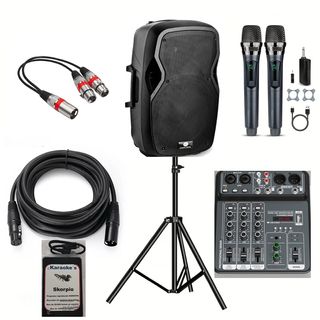 Equipo de sonido VONYX completo, ideal para karaoke y eventos. - Mezclador de 4 canales. - Altavoz de potencia. 200 W - Soporte para altavoz. - 2 micrófonos inalámbricos profesionales UHF con baterias recargables