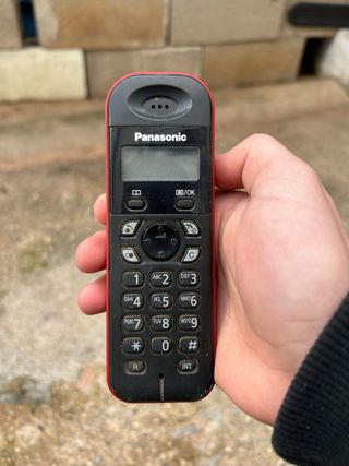 Teléfono fijo de la marca Panasonic en color rojo. - Diseño compacto y ergonómico. - Teclado numérico completo.