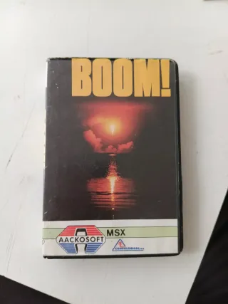 Cartucho de juego para MSX, título Boom!. - Diseño de portada con explosión al atardecer. - Incluye logos de Aackosoft y Compulogical S.A. se desconoce funcionamiento