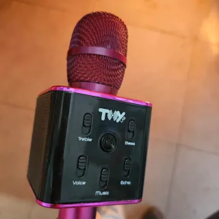 Micrófono de karaoke con un diseño llamativo y moderno. No envio - Acabado brillante en tonos rosa y morado. - Detalle de puntos decorativos en la parte superior. - Logotipo La Voz integrado en el diseño.