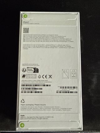 iPhone 17 negro de 256 GB, nuevo y precintado. Pantalla de alta calidad, rendimiento ultra rápido, cámaras de última generación y gran duración de batería. Móvil potente, elegante y listo para estrenar. Producto original, sin abrir. Con Factura. No negociable