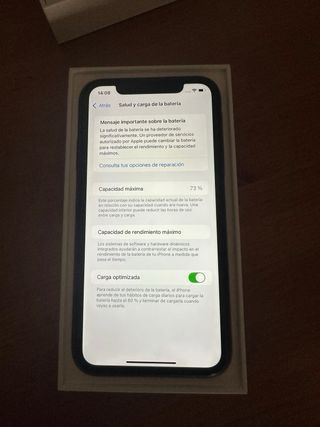 Teléfono móvil iPhone 11 en color negro. Todo es original y funciona perfectamente. Siempre usado con cristal templado, por lo que la pantalla esta intacta. Tiene leves signos de uso en los lados del teléfono, como puede apreciarse en las fotos. Salud de batería al 73%. Viene en caja original y con cable de carga. - Pantalla de 6.1 pulgadas. - Cámara dual de 12 MP. - Chip A13 Bionic. - Face ID