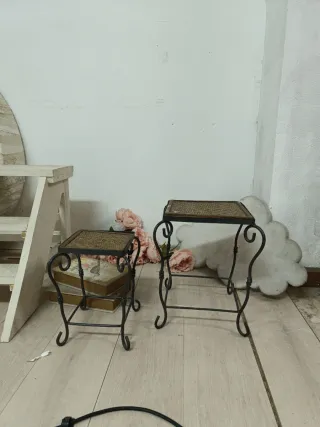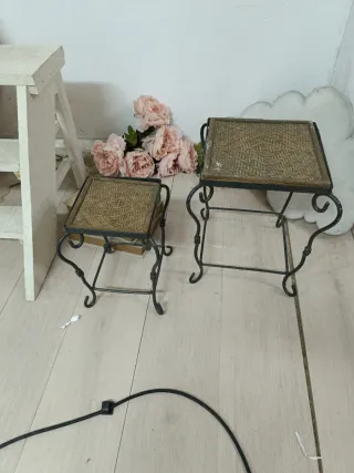 Set de dos mini mesitas ideales para fotografía. Su diseño vintage con detalles curvos las hace muy decorativas.una mide 45 otra 35 - Estructura de metal negro. - Superficie tejida.