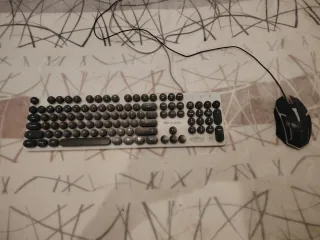 Conjunto de teclado y ratón gaming con un diseño moderno y luces. - Teclado con teclas redondas y retroiluminación. - Ratón ergonómico con diseño deportivo. - Ideal para sesiones de juego.