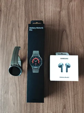 NO se vende por separado! Pack Samsung que incluye: - Smartwatch Galaxy Watch 5 Pro en color gris/plata. Como nuevo, sin signos de uso ninguno, muy cuidado. - Auriculares Galaxy Buds 3 sin abrir, lo estrenas tú, con garantía de Samsung hasta noviembre de 2029