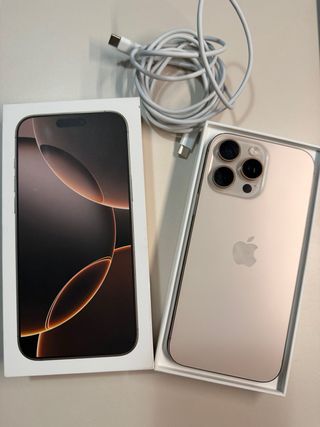 Teléfono iPhone 16 pro max color dorado de 256GB con caja incluida y cargador 1M. Puedo pasar más fotos sin problema. Única propietaria mujer de 50 años, teléfono muy cuidado y con la batería en perfecto estado. SALUD BATERÍA: 98% Pantalla siempre con protector cristal templado y siempre usado con funda. Se envía solo por Wallapop o entrega en mano cerca de Valencia - No respondo ofertas absurdas, tanto usted como yo sabemos lo que vale este teléfono.