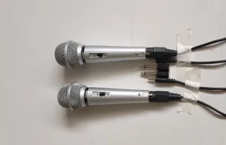 Micrófono de karaoke plateado con detalles en negro. - Incluye cable de conexión. - Conector jack de 6.35mm.