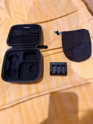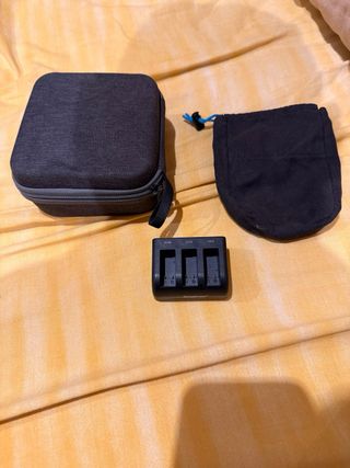 Set de accesorios para GoPro MAX 360. - Funda protectora con compartimentos interiores. - Bolsa de transporte con cierre de cordón. - Cargador triple para baterías.
