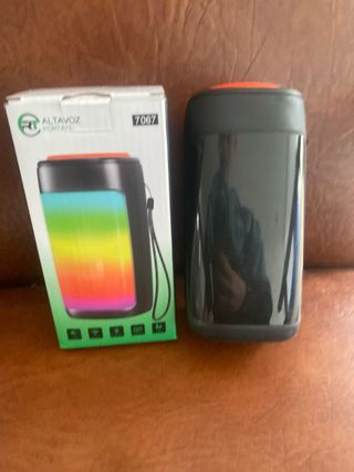 Altavoz portátil con un diseño moderno y luces LED. - Altavoz portátil RT modelo 7067. - Diseño cilíndrico con luces LED multicolores. - Correa para facilitar su transporte.