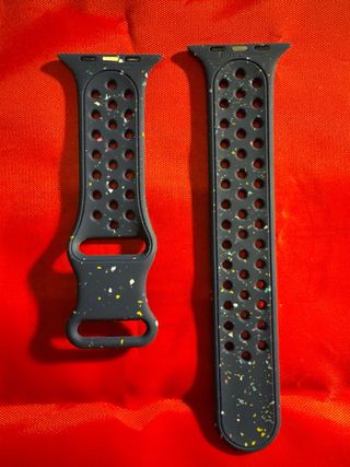Correa de repuesto para Apple Watch con un diseño moderno y deportivo. Fabricada en silicona flexible y duradera. - Diseño con múltiples perforaciones. - Acabado moteado con detalles de colores. - Cierre de pin y trabilla.