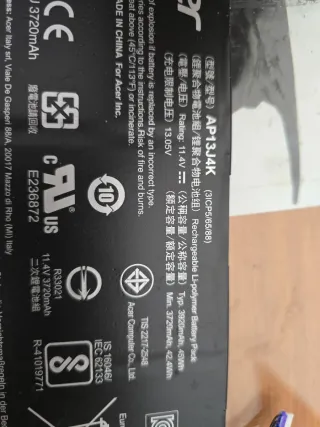 Batería de litio para portátil Acer. Sacada de acero chromebook C732-C94P - Modelo: AP13J4K - Voltaje: 11.4V - Capacidad: 3720mAh, 42.4Wh - Fabricada en China. SACADO DE DESPIECE DE PORTATIL FUNCIONANDO CON PANTALLA ROTA LA BATERIA CARGA Y AGUANTA SOBRE 6 HORAS