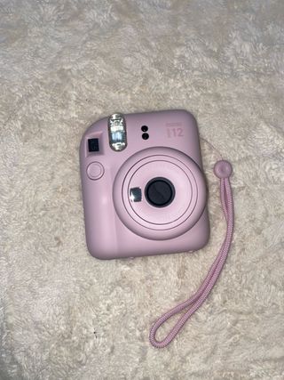 Cámara instantánea Fujifilm Instax Mini 12 en color rosa pastel. Ideal para capturar momentos especiales. - Diseño compacto y ligero. - Correa de mano a juego.