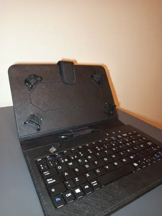 Funda protectora para tablet con teclado integrado. El diseño es elegante y funcional. - Material: Piel sintética. - Color: Negro. - Cierre de seguridad.