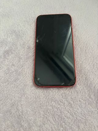 Teléfono móvil iPhone 12 en color rojo. - Diseño moderno y elegante. - Cámara dual. - Pantalla nítida. - Lo que se ve roto es la pantalla protectora