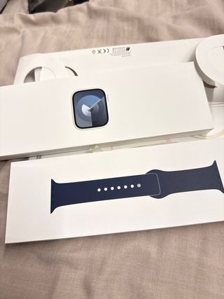 Reloj inteligente Apple Watch Series 9 de 45mm gris con correa azul marino, incluye caja y cargador, tiene algún pequeño roce en la pantalla que solo se nota cuando esta apagado y no se ve con la pantalla encendida Precio negociable