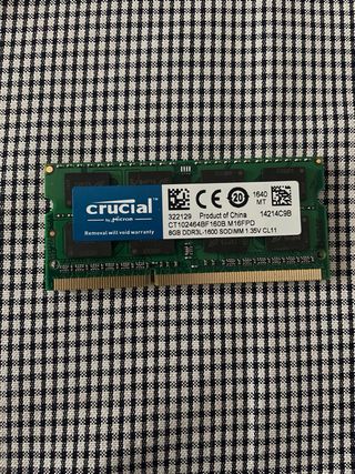 Módulo de memoria RAM Crucial de 8GB. - Tipo: DDR3L - Velocidad: 1600MHz - Formato: SODIMM - Voltaje: 1.35V - Latencia: CL11