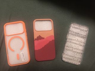 Tres fundas para iPhone 17 PRO - Funda naranja con MagSafe. - Funda con diseño de paisaje montañoso. - Funda transparente con partitura musical.