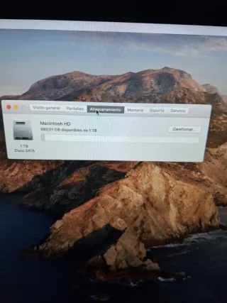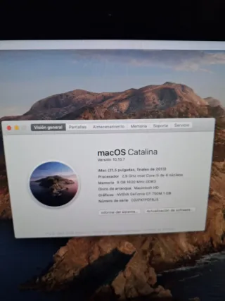 Ordenador iMac de 21,5 pulgadas, modelo de finales de 2013. Cuenta con un procesador Intel Core i5 y 8 GB de memoria RAM. - Procesador: 2,9 GHz Intel Core i5 (4 núcleos) - Memoria: 8 GB 1600 MHz DDR3 - Disco de arranque: Macintosh HD - Gráficos: NVIDIA GeForce GT 750M 1 GB
