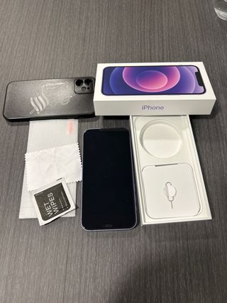 Se vende iPhone 12 en color morado, junto con sus accesorios. - Funda protectora negra. - Protector de pantalla puesto y otro mas. - Protector de lentes de camara. - cable de carga usb C. - salud de la bateria 91%