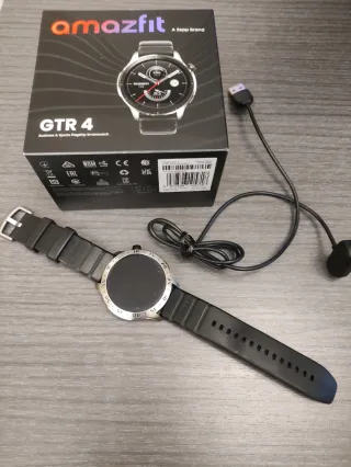 Reloj inteligente Amazfit GTR 4 en color plata. Diseño elegante y moderno. - Bisel de acero inoxidable. (Se puede quitar como la funda anti arañazos que tiene puesta) - Correa de silicona negra original. - Pantalla AMOLED. - Múltiples modos deportivos. - Cable cargador original. - Batería de 7 días con uso normal. - Auriculares Bluetooth incluido para el reloj. - Dos correas de acero y herramientas de ajuste. - Correa de cuero de verdad compatible. - Biseles de acero y protectores de pantalla anti arañazos de repuesto.