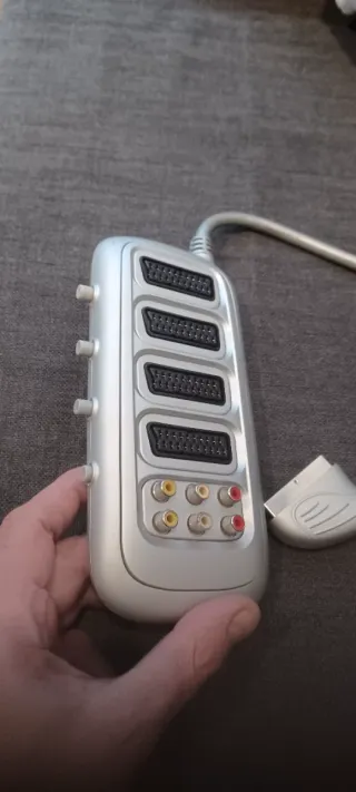 Adaptador de Euroconector para conectar varios dispositivos a tu televisión. Permite seleccionar la entrada deseada. - Cuatro entradas SCART (Euroconector). - Una salida SCART (Euroconector). - Conexiones RCA para audio y vídeo. - Diseño compacto y plateado.
