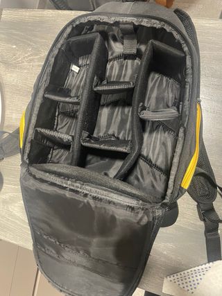 Mochila negra con detalles en amarillo, ideal para transportar tu equipo fotográfico. - Diseño moderno y funcional. - Compartimentos interiores para proteger tu cámara. - Cierre con cremallera y cordón ajustable.