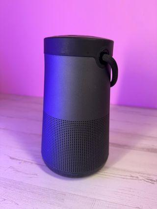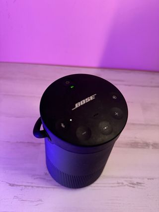 Altavoz portátil de sonido envolvente. Su diseño cilíndrico permite una dispersión del sonido de 360 grados. - Asa de transporte integrada. - Indicador de batería. - Botones de control en la parte superior.