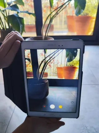 Tablet Samsung Tab A en color negro y blanco. Ideal para uso diario. Funda recién comprada, sirve de soporte para ver pelis y videos - Pantalla de 10.1 pulgadas. - Diseño delgado y ligero. - Cámara trasera y frontal.