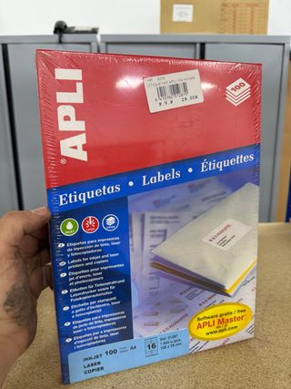Lote de 10 paquetes de etiquetas APLI, modelo 9230. - Cada paquete contiene 100 hojas. - Etiquetas aptas para impresoras inkjet, láser y fotocopiadoras. - Formato A4. - Tamaño de etiqueta: 105 x 35 mm.