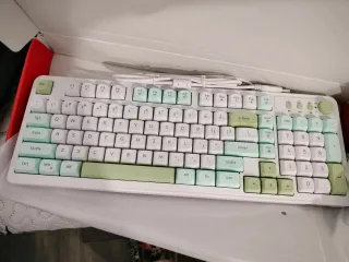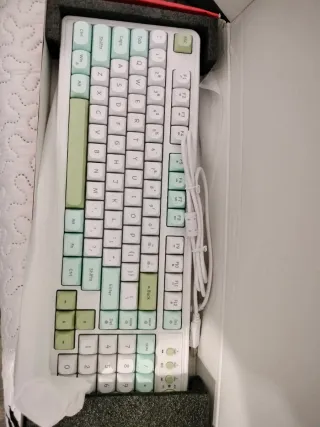Teclado mecánico con un diseño moderno y atractivo, combinando blanco y verde. - Teclas con retroiluminación. - Diseño compacto TKL (Tenkeyless). - Cable USB