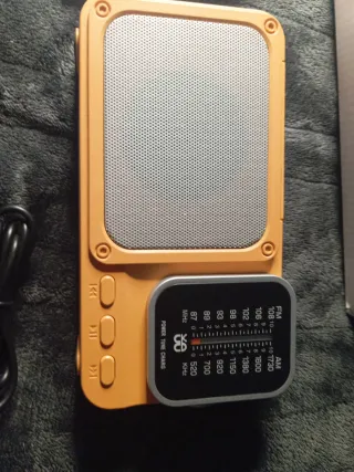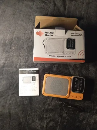 Radio portátil con funcionalidad de reproductor de música. - Diseño compacto y funcional. - Admite tarjetas TF y conexión Bluetooth. - Puerto de carga USB-C. - Conector para auriculares.