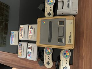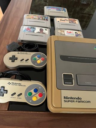 Consola Super Famicom en color beige, un clásico para los amantes de los videojuegos retro. Incluye mandos y varios juegos. - Super Game Boy - Mandos de Super Famicom. - Juegos de Super Famicom. Está amarillenta y presenta rotura en la parte trasera. Funcionaba perfectamente, pero la guardé y ahora no encuentro los cables. Se vende todo lo que se ve, sin probar y sin cables
