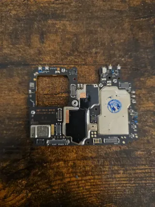 Placa base de un dispositivo Xiaomi. Presenta componentes electrónicos y metálicos. - Componentes electrónicos variados. - Cubiertas metálicas de protección.